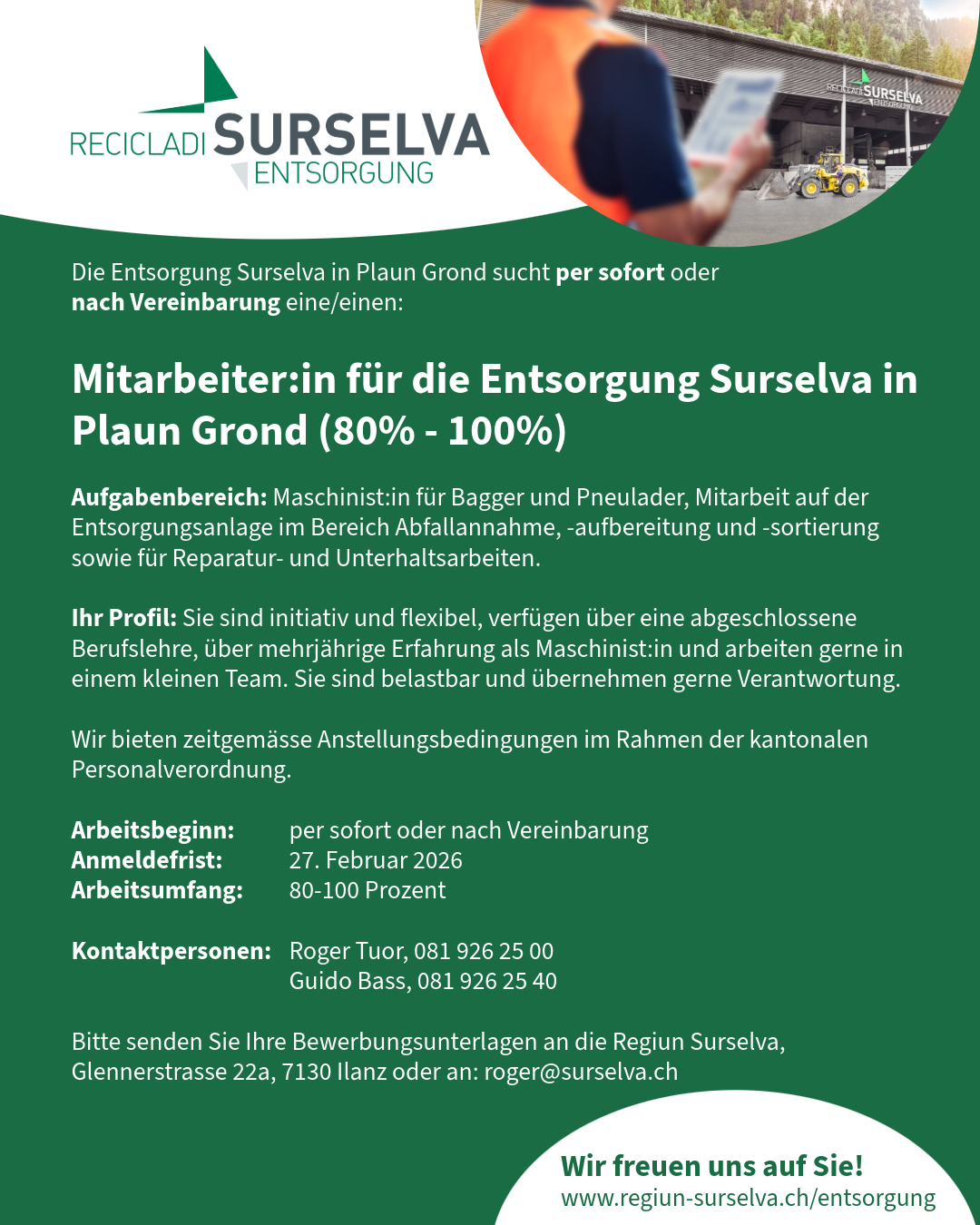 Mitarbeiter:in für die Entsorgung Surselva in Plaun Grond