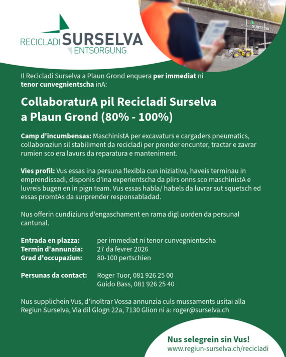 Il Recicladi Surselva a Plaun Grond enquera per immediat ni tenor cunvegnientscha inA: